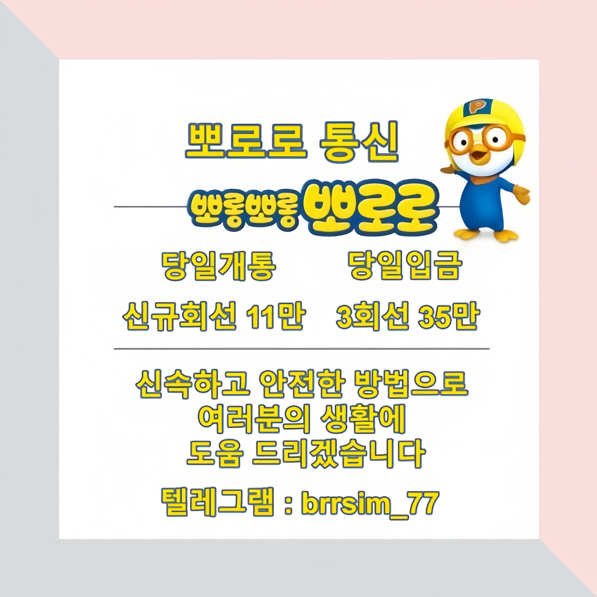 어설픈 신규업체,유령 업체에서 시간낭비 하지마시고 5년차 무사고 뽀로로 통신과 함께하세요https://brrsim77.isweb.co.kr